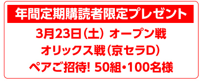 3月16日(土) オープン戦 埼玉西武戦(甲子園)ペアご招待! 50組・100名様 |